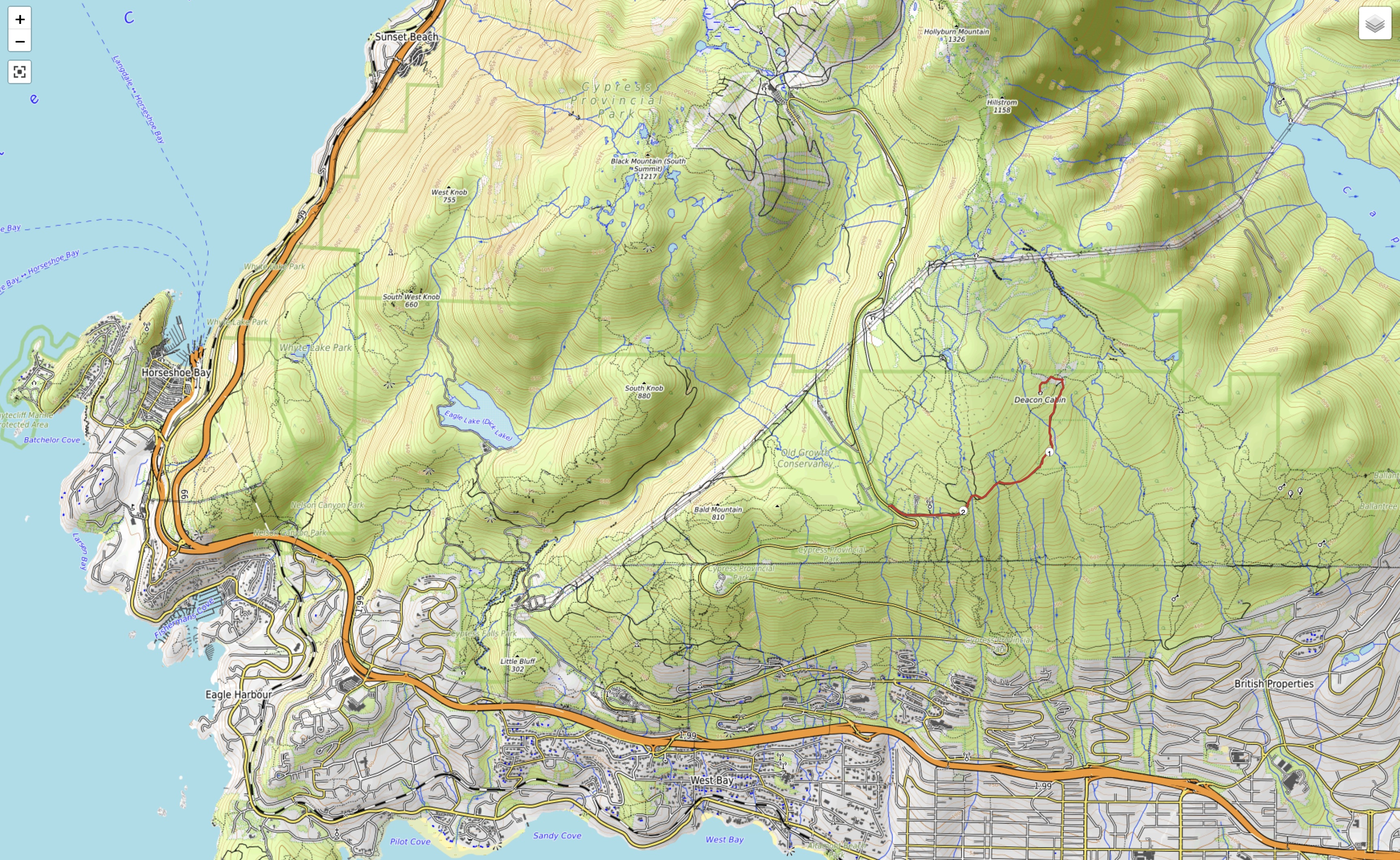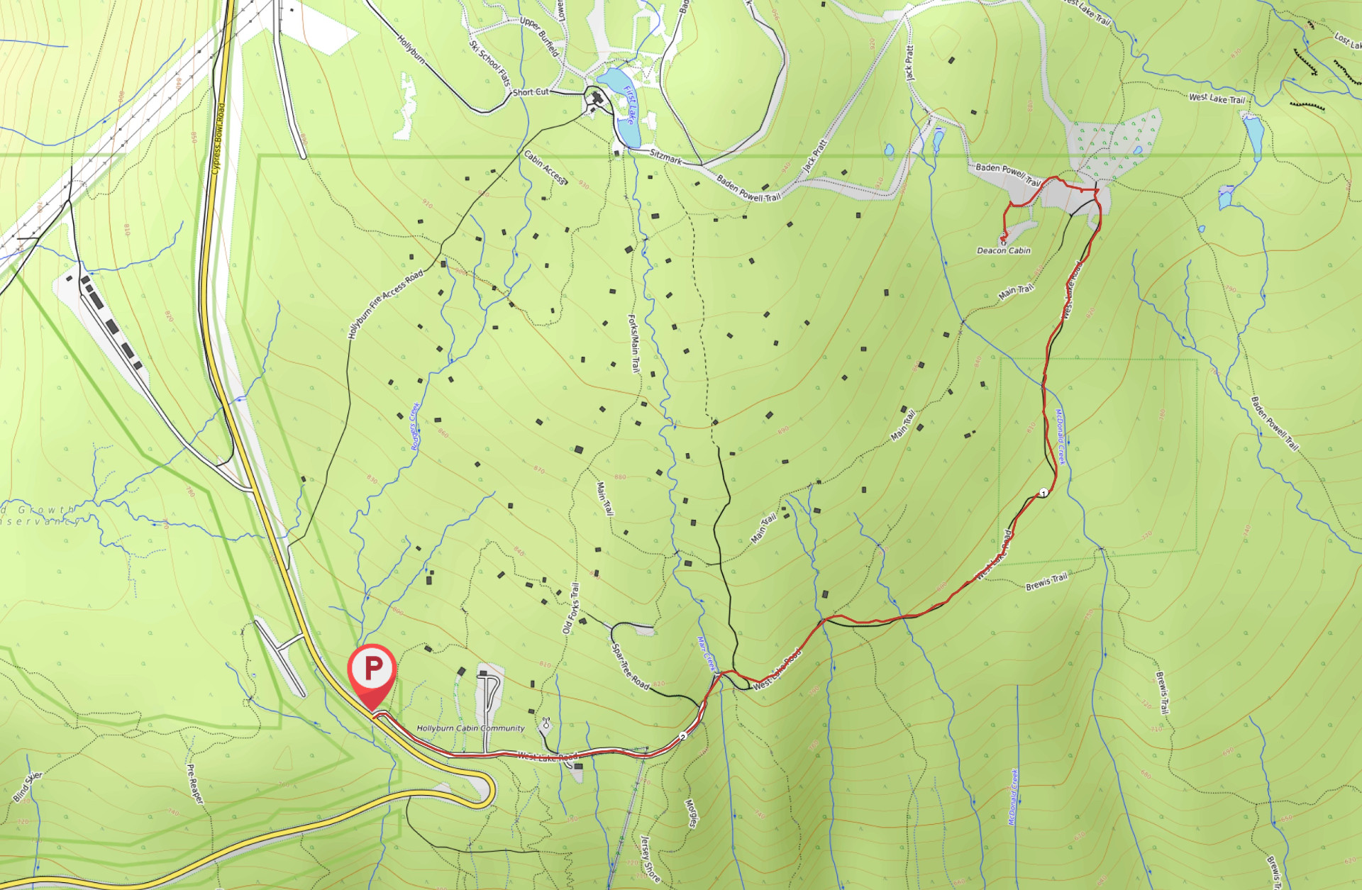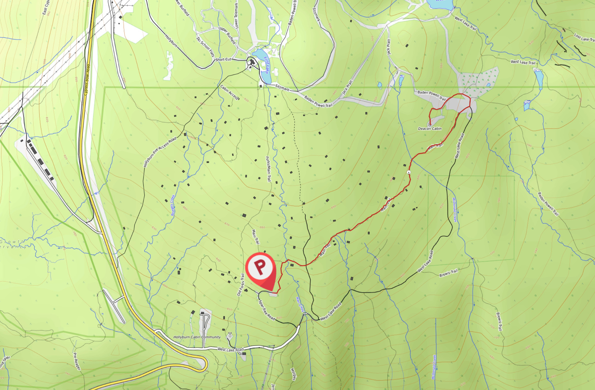 West Lake Road to Norm Deacon Cabin GPX fileThe Norm Deacon Cabin is located at coordinates: 49.3729, -123.1733Winter Routefollow the road on up and go past the gate.- Eventually you will come to a large open area and on your left is a post with an orange marker on it.- Turn left here at the post. Now go down then up and follow the winding snow covered road to the cabin- Do not follow the ski run!